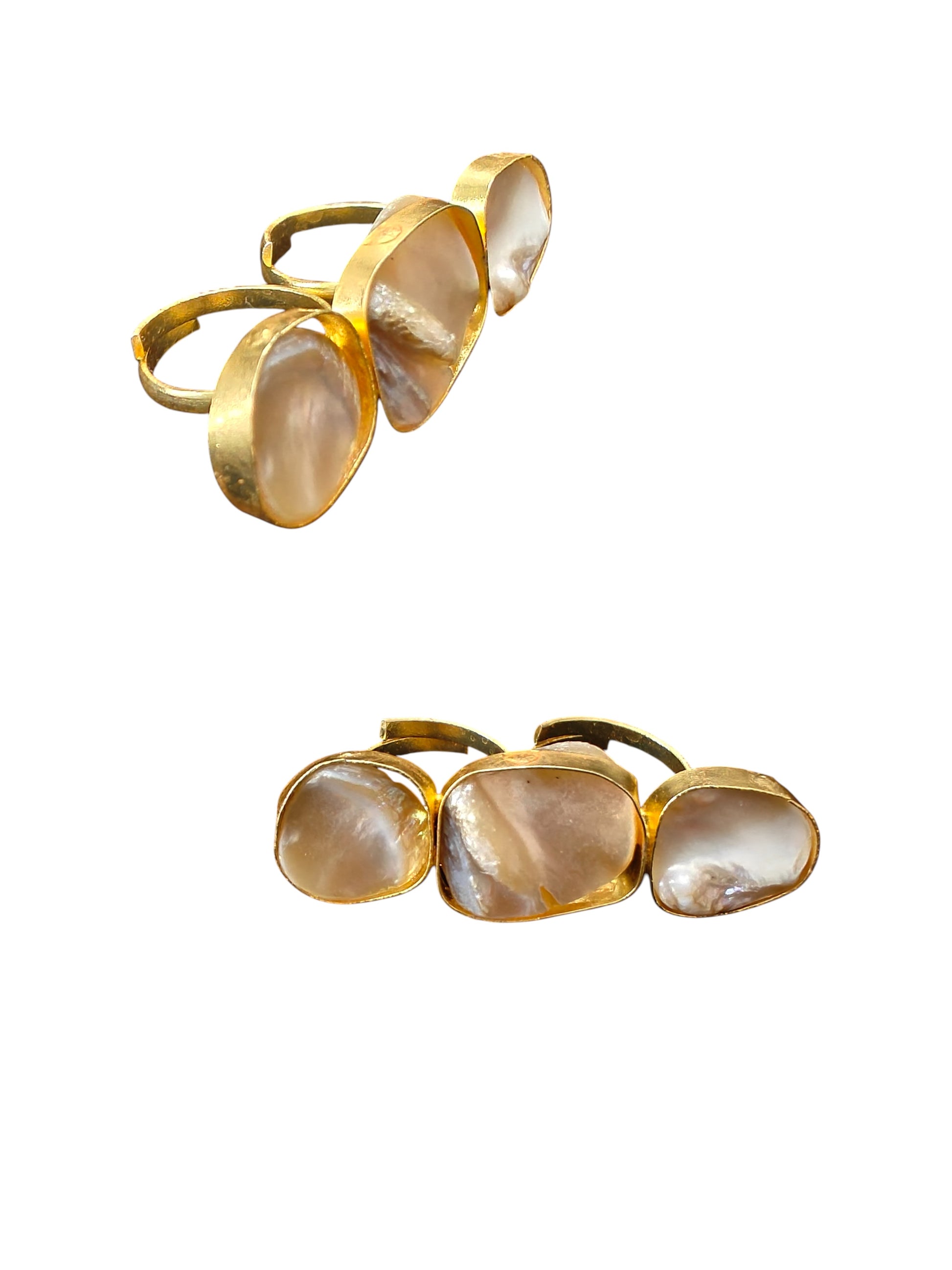 The Aahana Mother of Pearl Ring is a celebration of natural beauty and understated elegance. Featuring three luminous mother of pearl pieces in soft, iridescent tones, set in a handcrafted gold-plated frame, this adjustable ring exudes timeless sophistication. Its organic, minimal yet bold design makes it perfect for pairing with both contemporary and traditional outfits. A versatile statement piece, it adds a touch of effortless charm to any look.