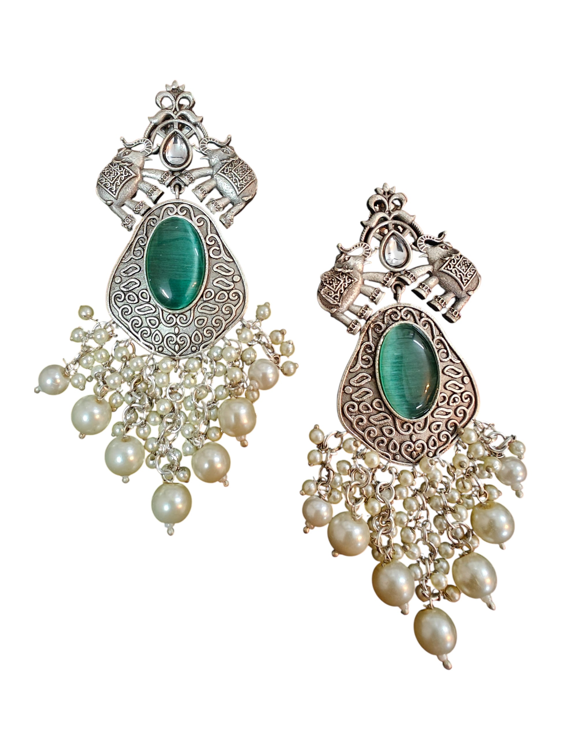 Embrace regal artistry with the Hasti Charm Silver Oxidised Earrings, featuring intricately carved elephant motifs that symbolize strength and prosperity. The central polished stone adds a striking focal point, while the cascading moti latkan detailing enhances the elegance with a graceful sway. A perfect blend of traditional charm and statement-making design, these earrings are ideal for festive occasions, weddings, and cultural celebrations.