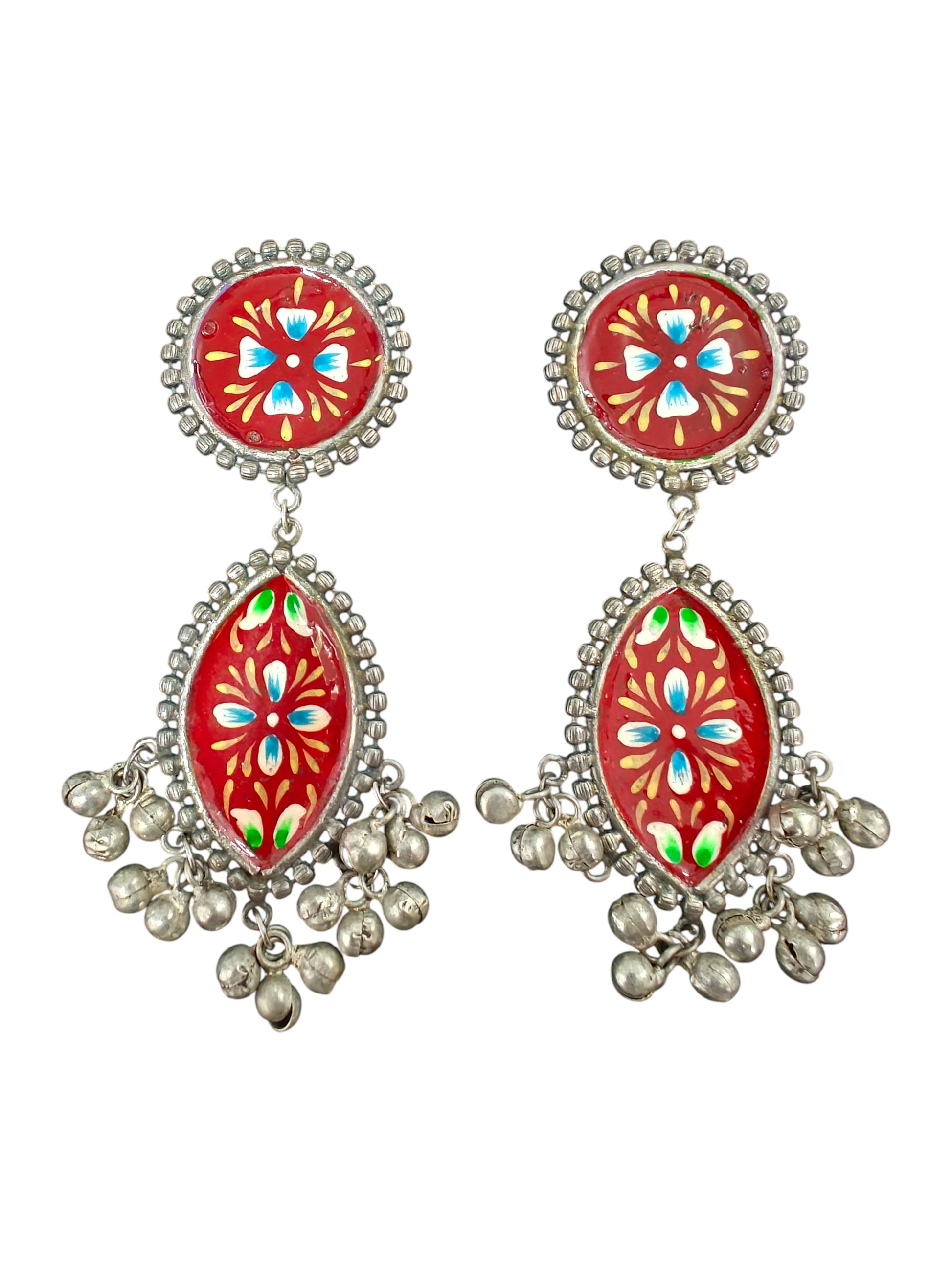 Add a regal touch to your festive look with our Rajwada Red Handpainted Ghungroo Earrings. Featuring a vibrant red enamel base adorned with intricate hand-painted floral motifs in shades of blue, green, and gold, these earrings are a true work of art. The oxidised silver finish beautifully frames the design, while the playful ghungroo latkan adds a traditional charm with every movement. Perfect for weddings, festive occasions, or statement styling, these earrings are a blend of heritage craftsmanship and timeless elegance.