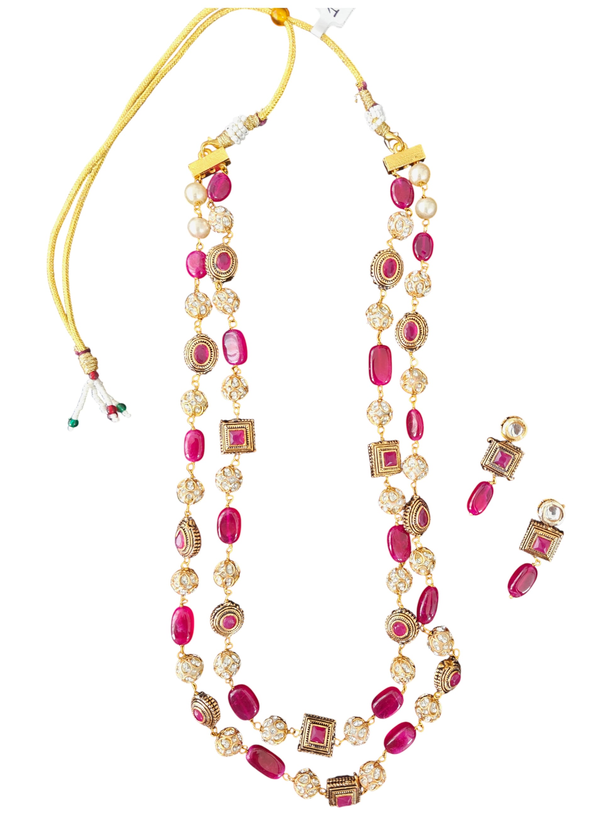 Step into grandeur with our Royal Double Layer Stone Work Necklace Set, a true masterpiece of craftsmanship and elegance. Designed with two intricately handcrafted layers, this necklace features a blend of bold ruby-toned stones, kundan-studded beads, and exquisite square motifs that add depth and richness to its design. The matching earrings complete the regal look, making it the perfect choice for weddings, festive occasions, and cultural celebrations.