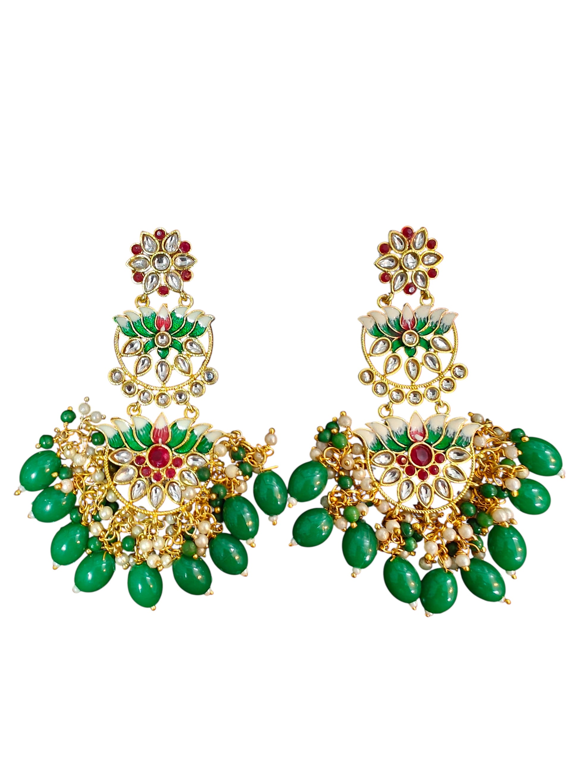 Bring a touch of regal charm to your festive look with the Emerald Bloom Kundan Jhumkas. Crafted with traditional kundan artistry, these handpainted earrings feature delicate floral motifs in soft green and ivory tones. Adorned with moti latkan detailing and vibrant green bead drops, they exude a perfect mix of elegance and vibrancy. Designed for grand occasions, these earrings will beautifully complement both ethnic and Indo-western ensembles.