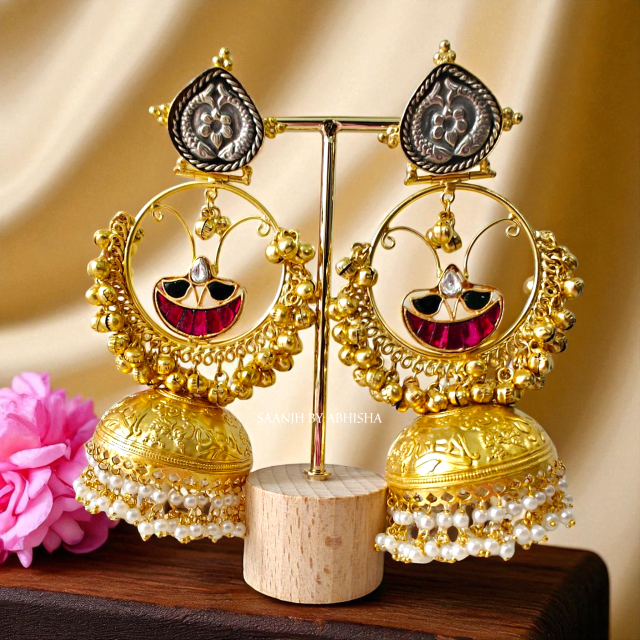 Elevate your festive look with the Divya Brass Jhumka, a perfect blend of traditional artistry and modern elegance. The top features an oxidized silver-tone floral motif, while the bold circular frame is adorned with golden beads and a striking diya-inspired centerpiece in rich red and black enamel. The intricately carved golden dome jhumka is finished with delicate moti latkans, adding timeless charm and graceful movement. Ideal for weddings, cultural celebrations, and festive occasions, these statement jhumkas embody heritage with a royal twist.