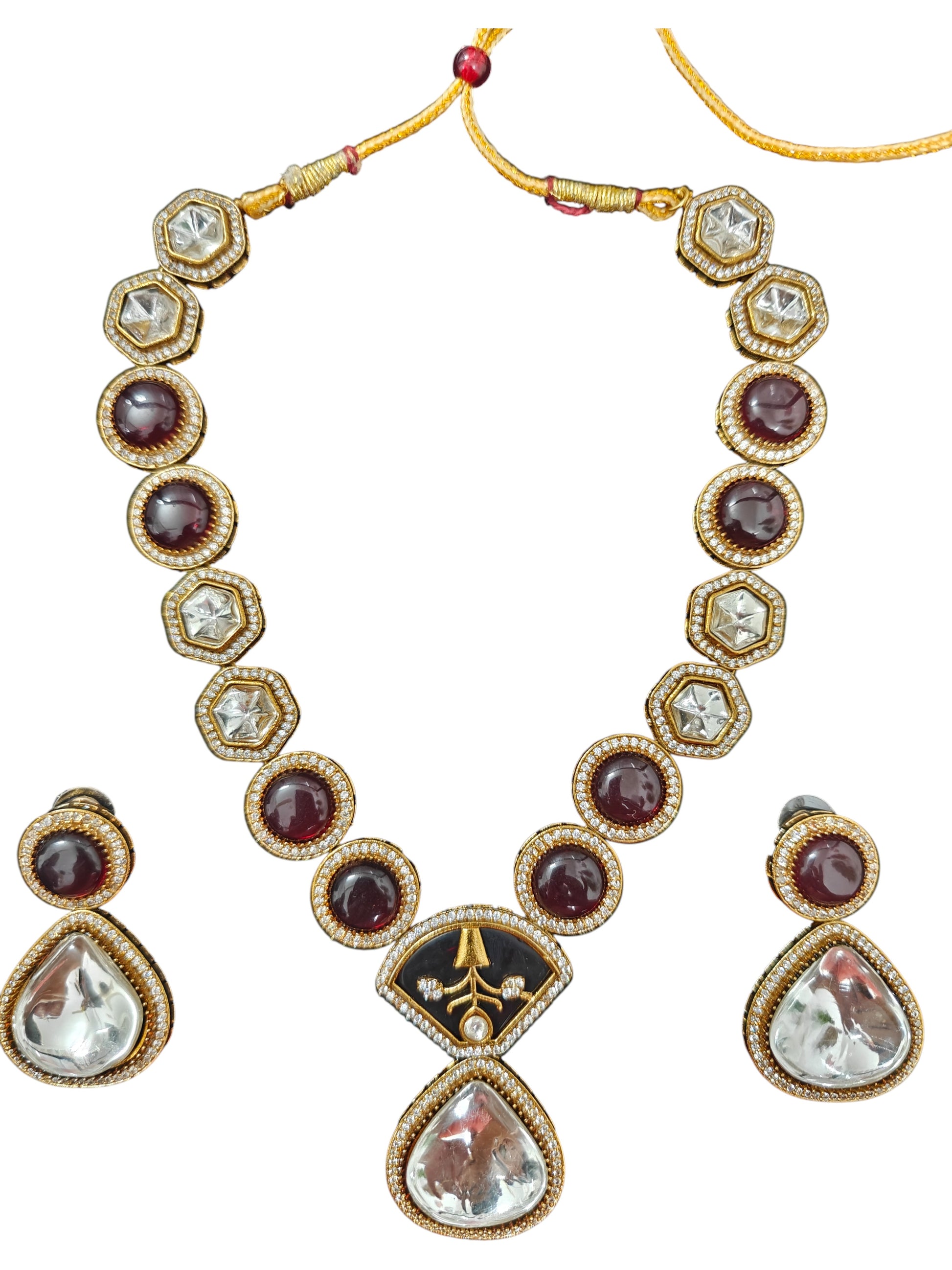 Elevate your traditional look with our Royal Ruby Kundan Stone Work Necklace Set, a timeless blend of elegance and grandeur. Handcrafted with precision, this exquisite set features deep ruby-toned stones beautifully paired with intricate kundan work and delicate stone detailing. The centerpiece pendant adds a regal touch, while the matching earrings complete the look with effortless grace. Perfect for weddings, festive occasions, and celebrations, this necklace set is designed to make you shine with unmatched sophistication.