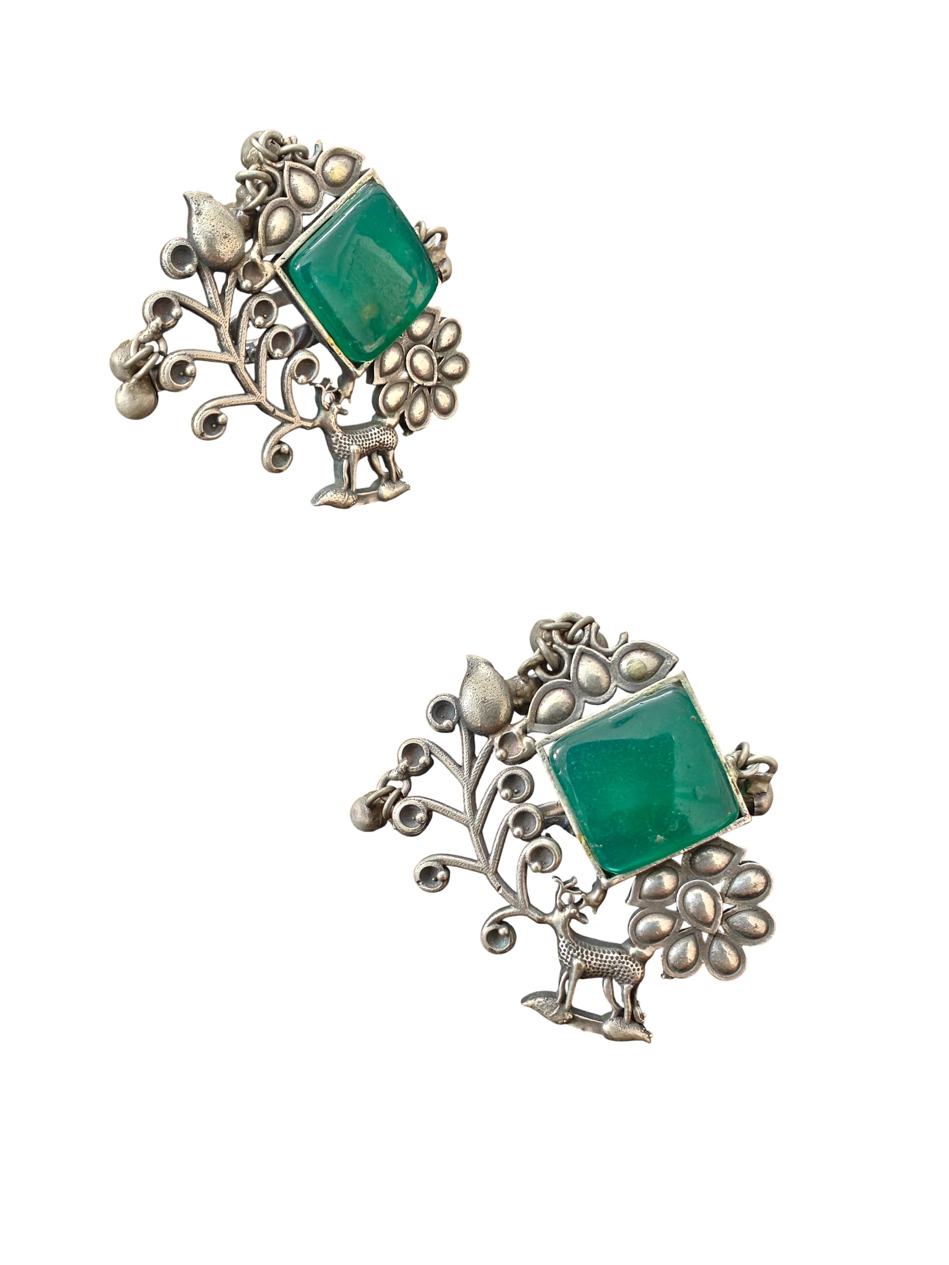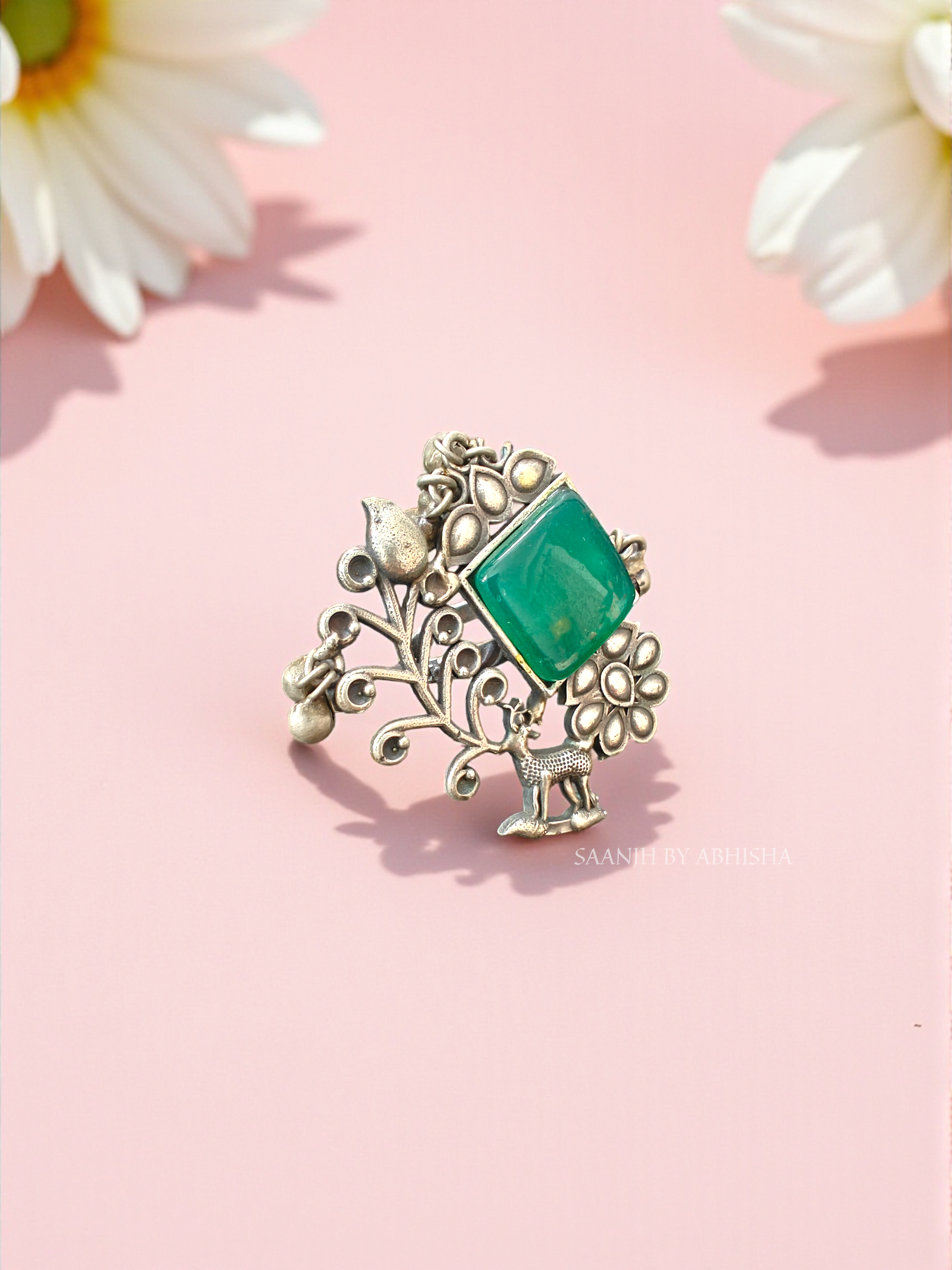 Inspired by the beauty of nature, the Vanya Silver Replica Ring is a true statement of heritage artistry. Crafted in oxidised silver, it features a striking green stone at the center surrounded by intricate floral and leafy patterns. The design is brought to life with charming details like a delicate bird and a deer, symbolizing harmony with nature. Finished with tiny ghungroo accents, this adjustable ring is perfect for festive wear, weddings, or adding a touch of rustic elegance to your everyday look.