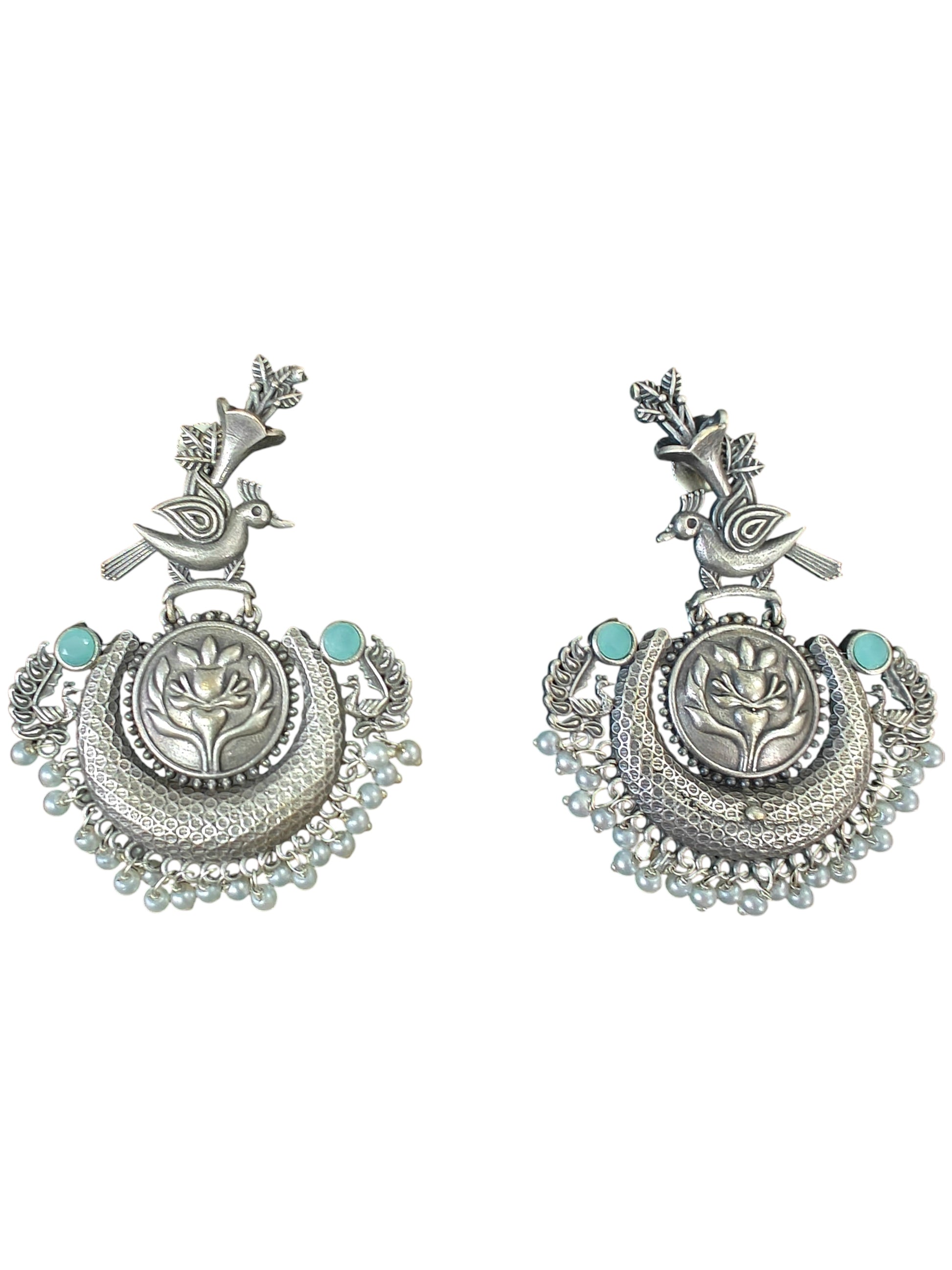 Celebrate heritage with the Mayura Phool Silver Oxidised Earrings, designed with intricate floral engravings and bird motifs that symbolize grace and prosperity. Accented with subtle turquoise stones and finished with delicate pearl-style latkan detailing, these earrings radiate an ethnic yet timeless charm. Perfect for festive wear, weddings, and traditional occasions, they effortlessly complement sarees, lehengas, and fusion outfits.