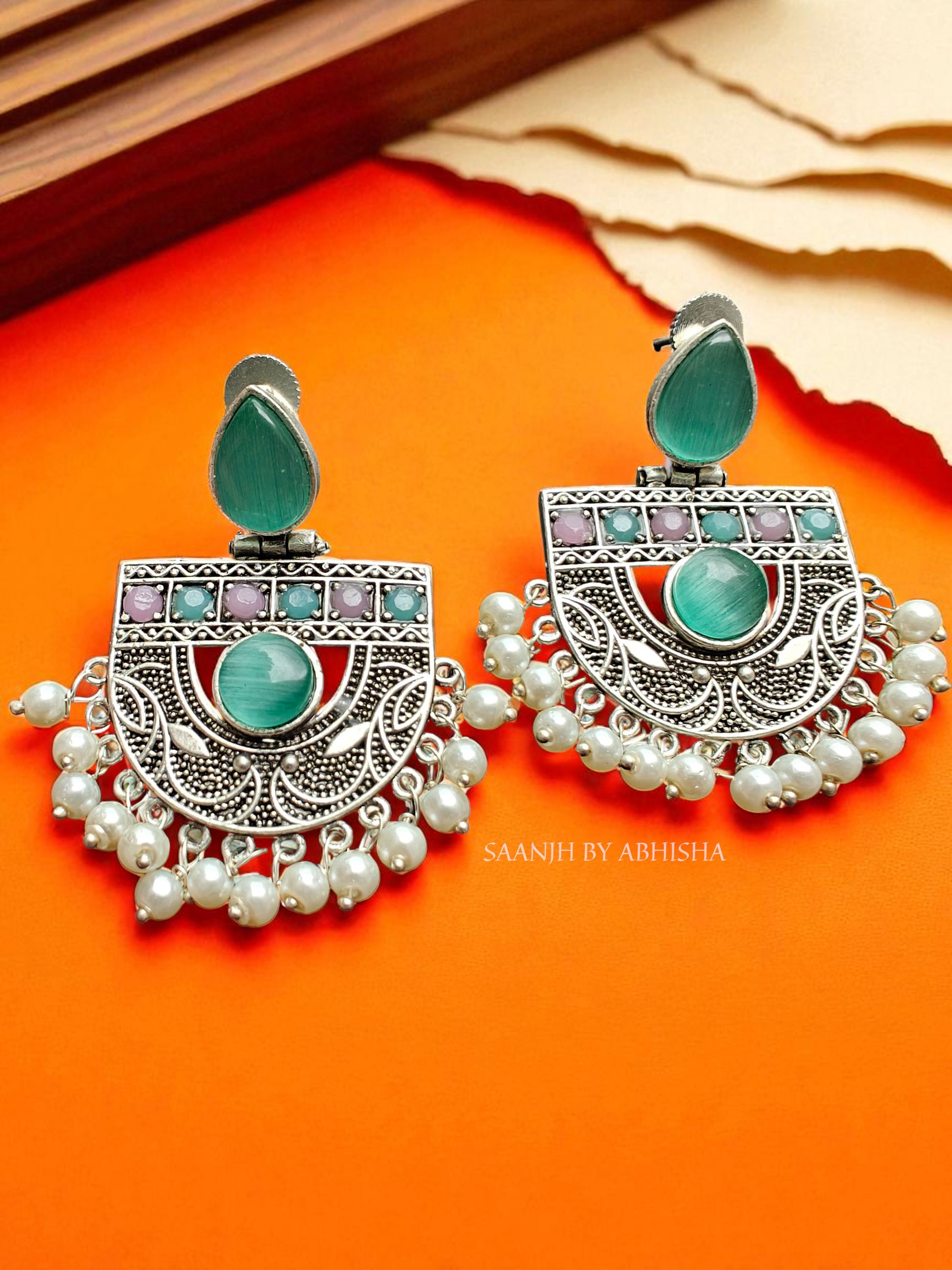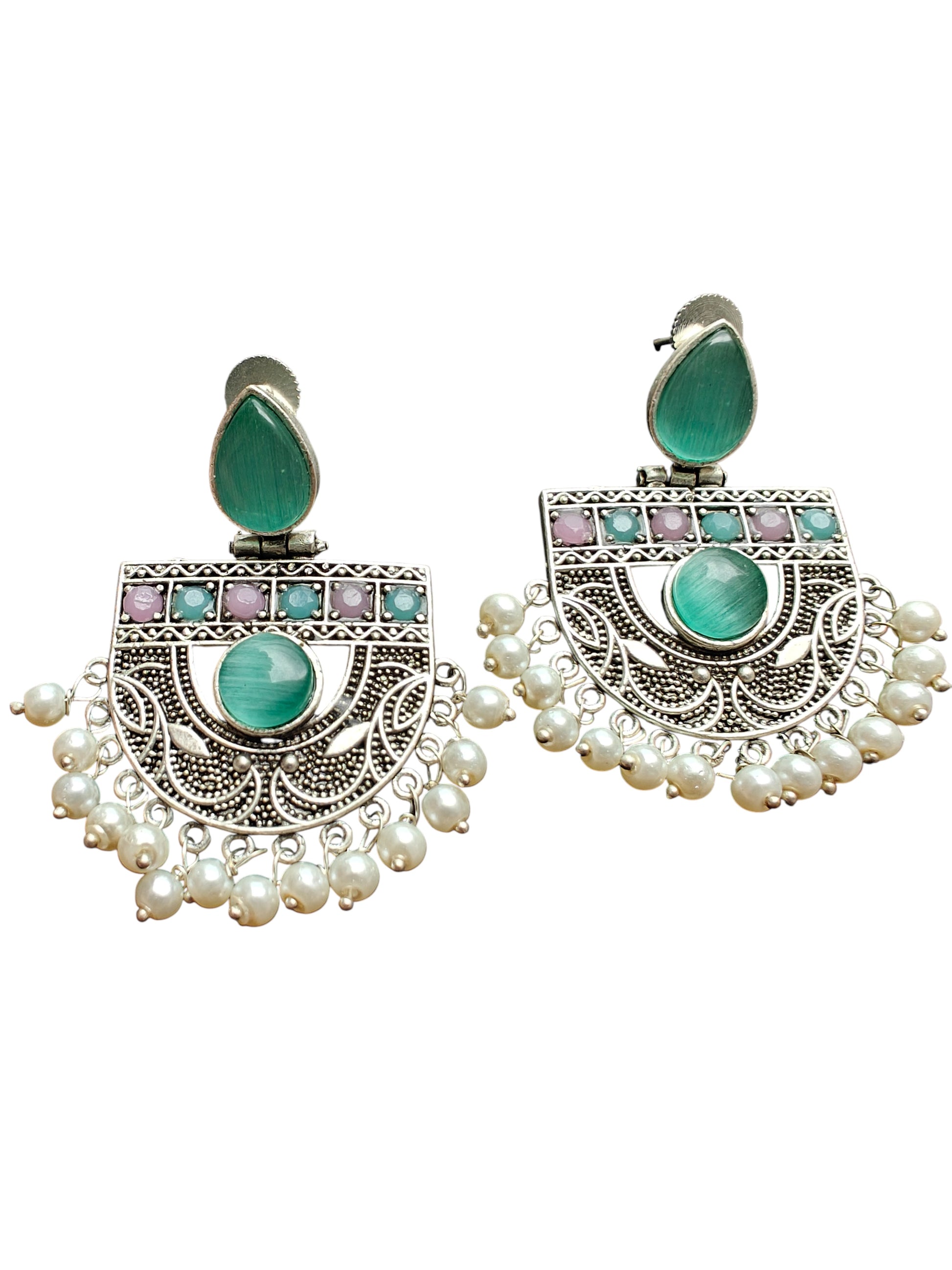 Add a regal charm to your collection with these royal oxidised silver earrings, adorned with soothing mint stones and pastel accents. The intricate silver carvings are complemented by a bold circular centerpiece, finished with delicate moti drops that sway gracefully with every movement. Perfect for weddings, festive celebrations, or cultural gatherings, these statement earrings beautifully merge traditional artistry with a refreshing modern touch.