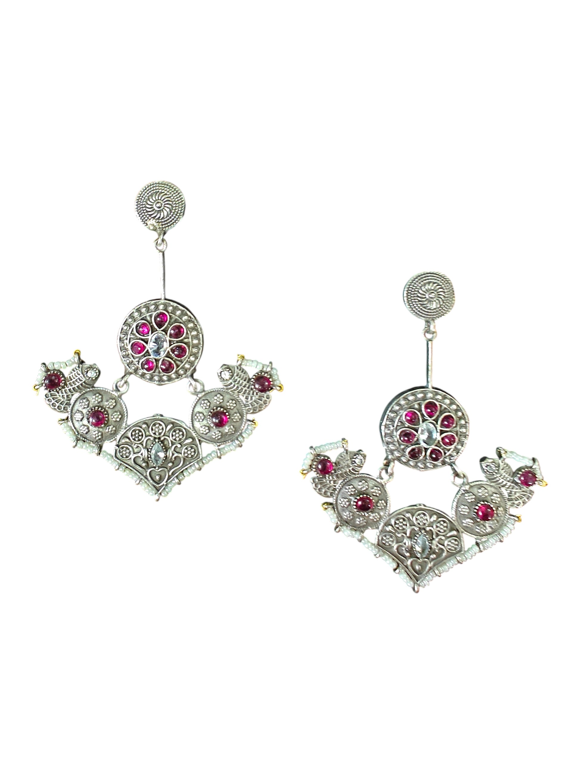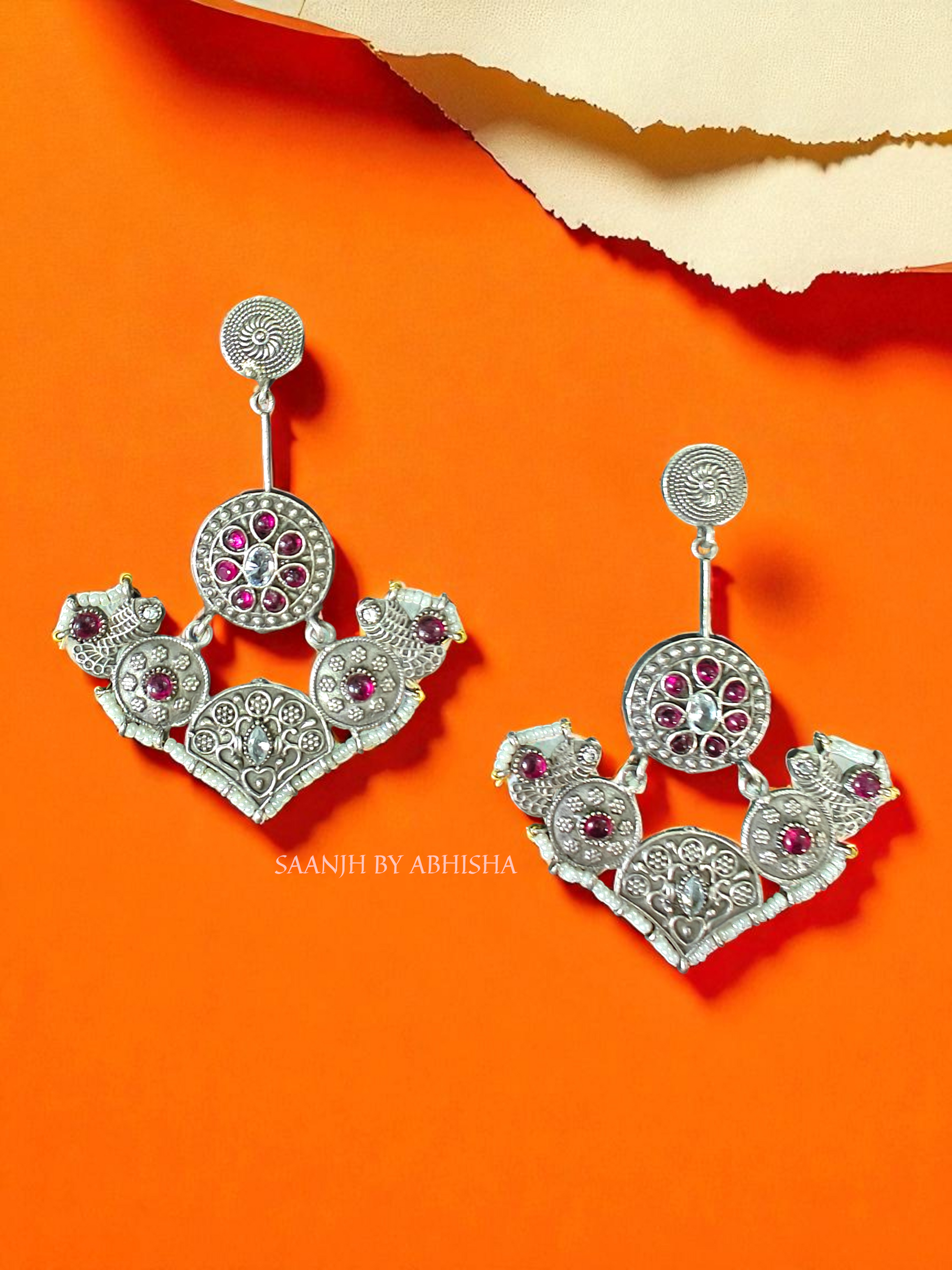 Embrace timeless elegance with the Rajwada Silver Oxidised Earrings. Featuring intricate oxidised detailing, royal motifs, and delicate stone embellishments, these earrings reflect regal artistry at its finest. The unique triangular drop design makes them a standout accessory for weddings, festive occasions, and traditional gatherings. Pair them with your sarees, lehengas, or fusion wear to add a statement touch.