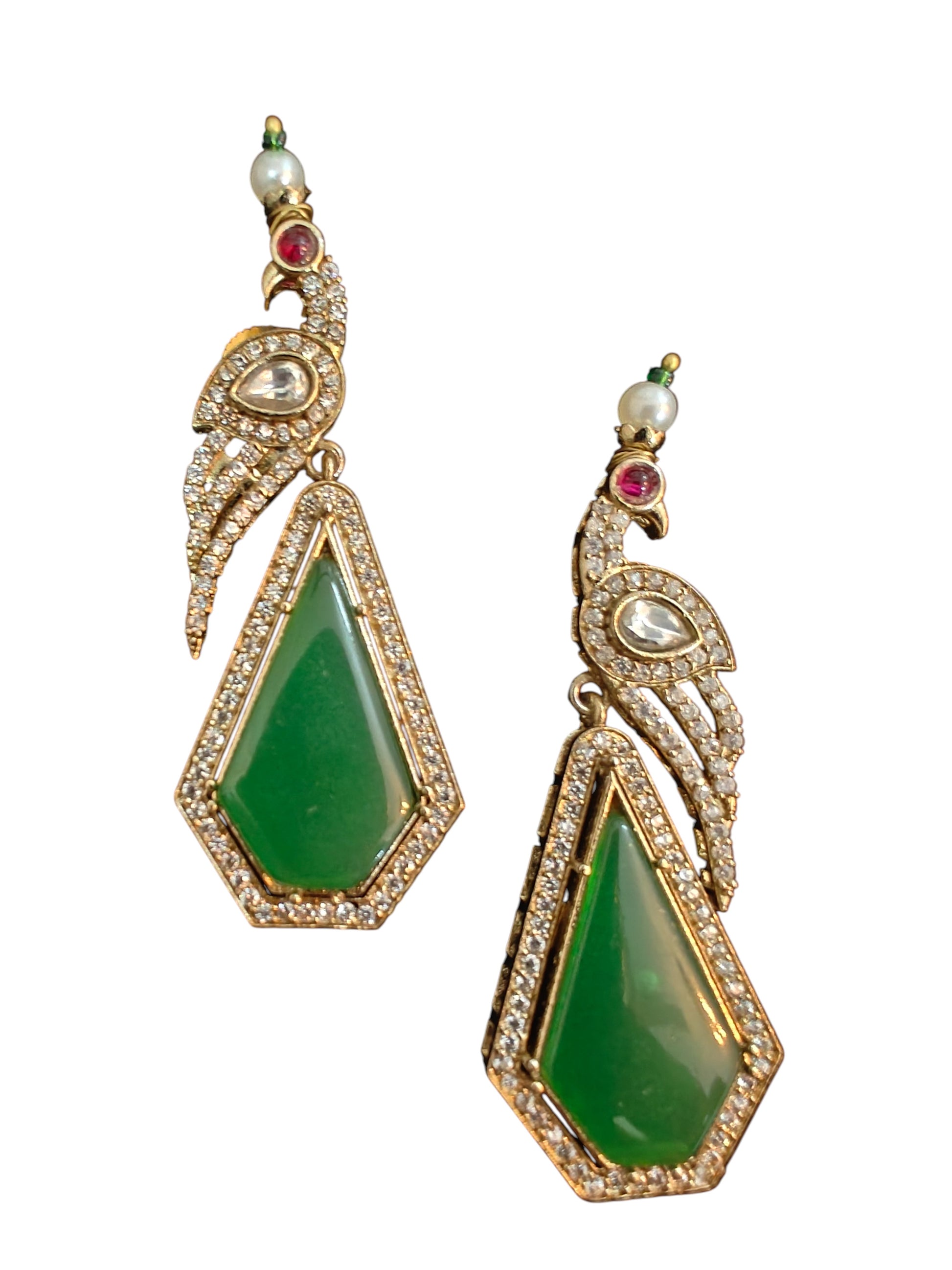 Step into timeless elegance with the Emerald Grace Silver Oxidised Earrings. These statement earrings feature a striking green stone centerpiece framed with sparkling American diamond accents, beautifully set in a regal design. The top portion is adorned with delicate pearl and ruby-toned embellishments, adding a touch of sophistication and grandeur. Perfect for festive occasions, weddings, and celebrations, these earrings exude royalty with a modern flair.