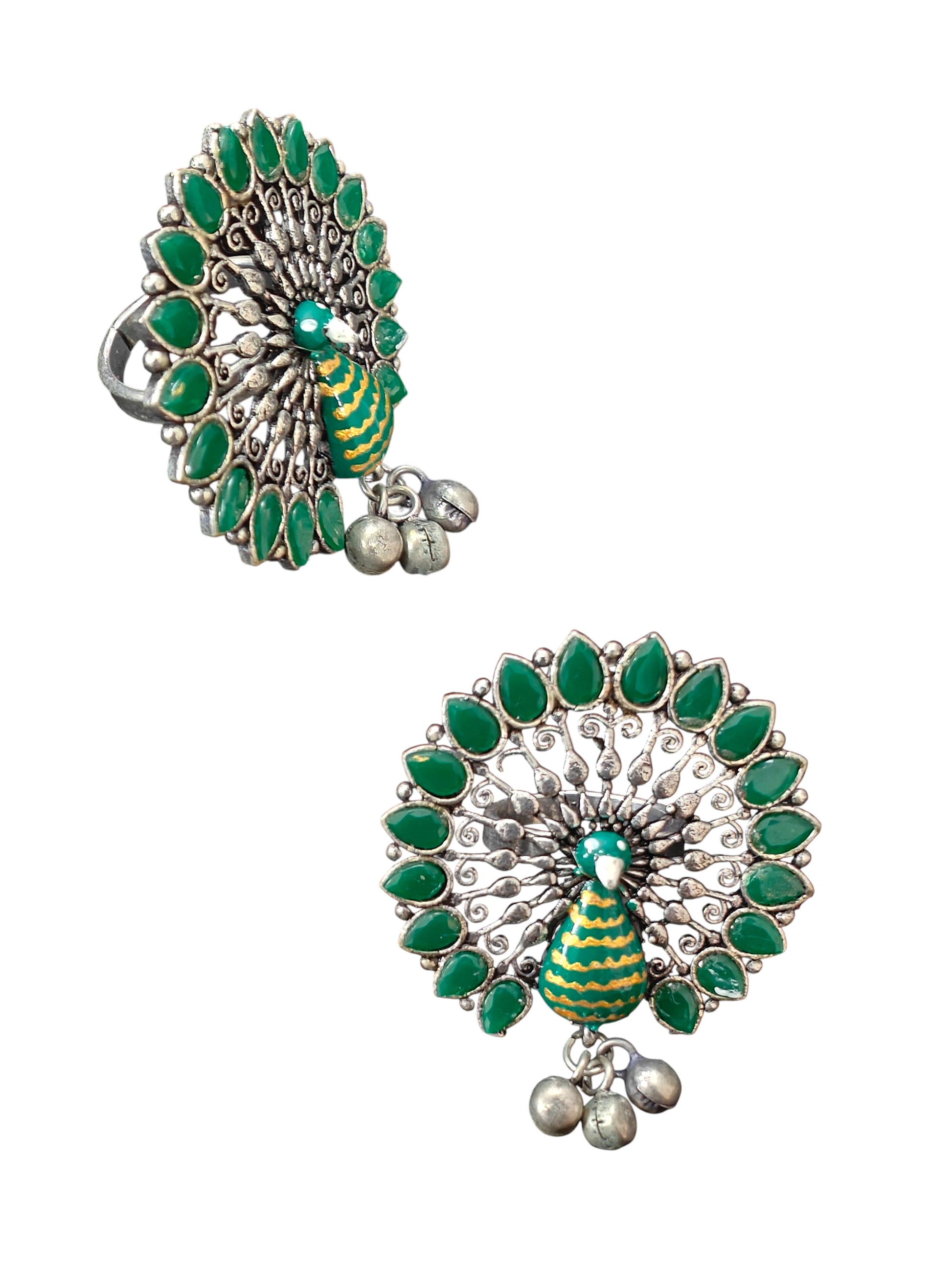 Bring home the beauty of tradition with the Morni Handpainted Silver Replica Ring. Designed in a majestic peacock motif, this adjustable ring features a vibrant hand-painted body in shades of green and yellow, surrounded by green stone-studded feathers. The oxidised silver base adds depth, while the playful ghungroo drops enhance its ethnic charm. Perfect for festive occasions, weddings, or cultural celebrations, this ring is a true statement piece that reflects grace, heritage, and artistry.