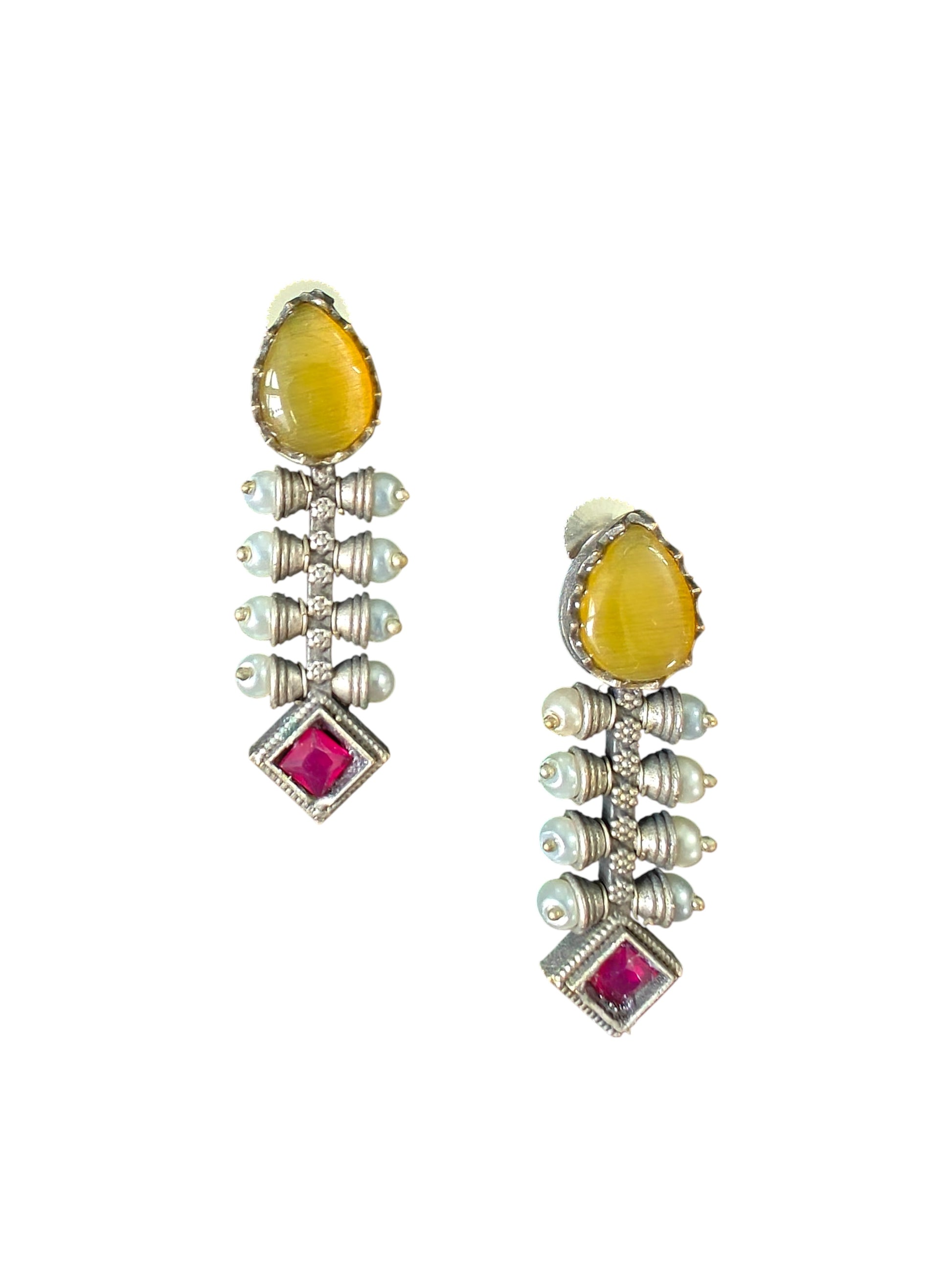 Step into timeless elegance with these royal oxidised silver earrings, designed with a striking combination of heritage motifs and contemporary detailing. Featuring a bold yellow stone at the top, a line of intricate oxidised beads, and a vibrant ruby stone at the base, this design is further accentuated with delicate moti embellishments. A perfect blend of grace and grandeur, these earrings are ideal for festive occasions, weddings, and celebrations, making them a must-have statement piece in your jewellery collection.