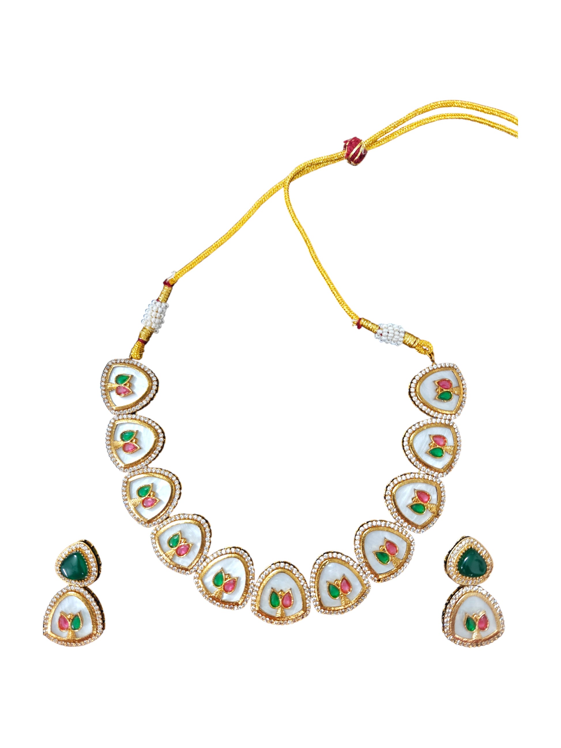 Exude regal elegance with our Royal Pachi Kundan Stone Work Necklace Set, an exquisite piece of heritage-inspired jewellery. Handcrafted with traditional pachi kundan artistry, this necklace features intricate stone detailing in vibrant hues of green and pink, set against a lustrous base with pearl-like accents. The matching earrings complete the set, making it a perfect choice for weddings, festive occasions, and royal celebrations.