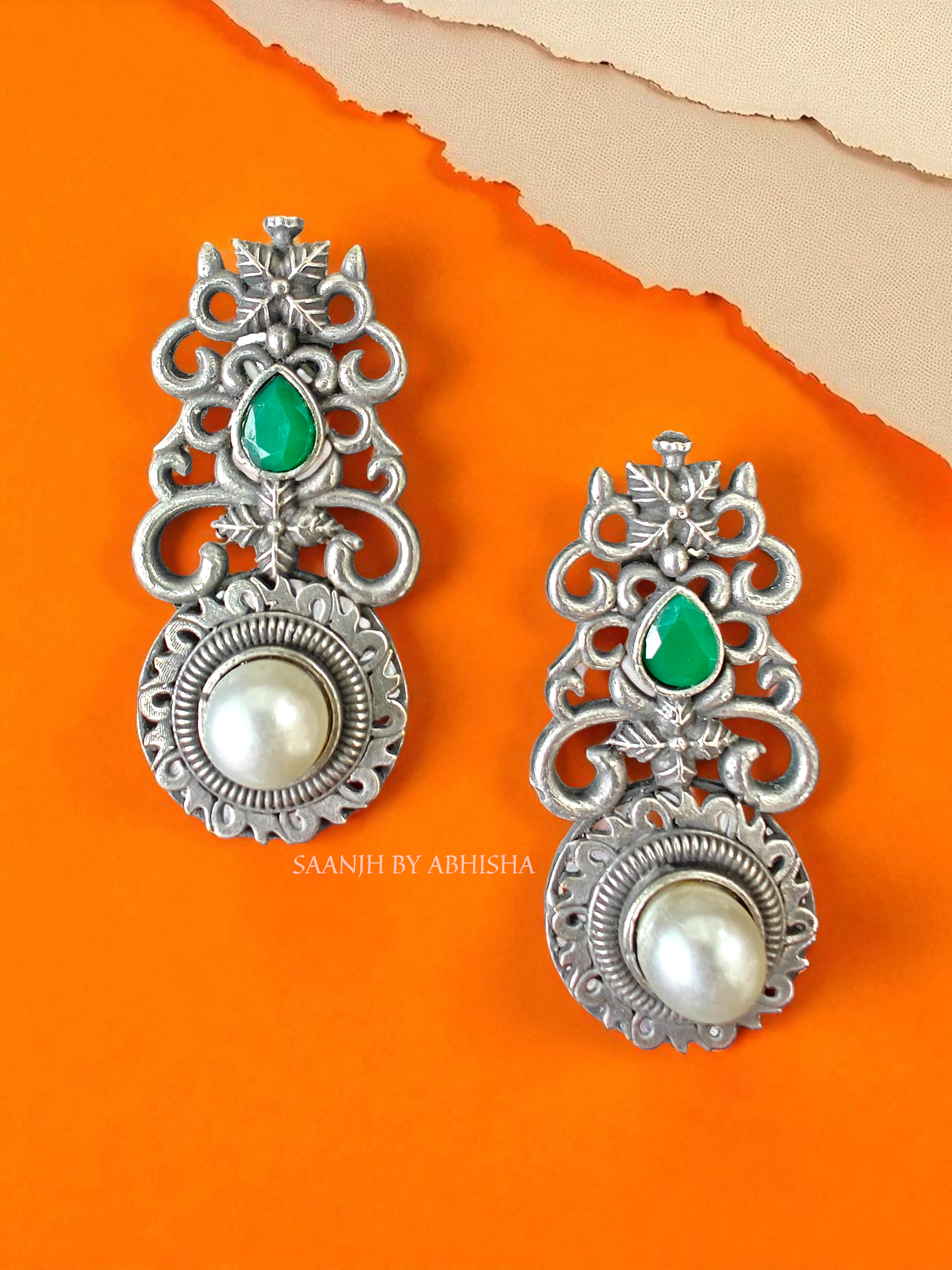 Add a regal touch to your ensemble with these royal oxidised silver earrings, intricately designed with traditional patterns and fine craftsmanship. Featuring a striking green stone accent at the top and a bold pearl centerpiece at the base, the design radiates timeless elegance. The antique silver finish enhances its heritage appeal, making it a perfect choice for weddings, festive occasions, and cultural celebrations. A statement piece that beautifully blends tradition with sophistication.